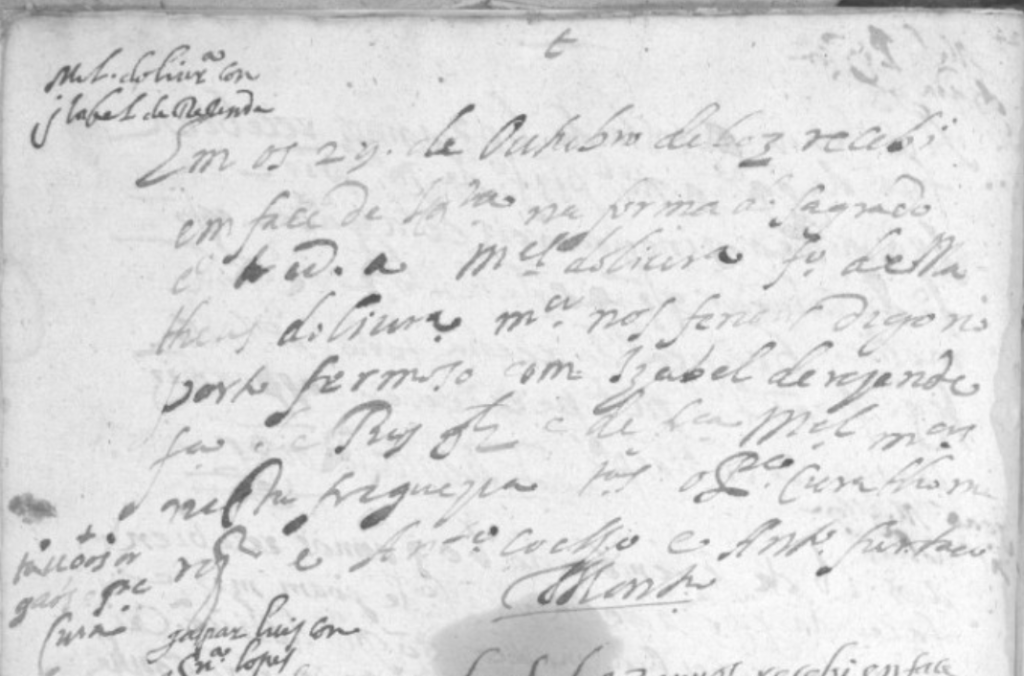 “Em os 29 de Outubro de 603 recebi em face da Igreja na forma do Sagrado […] MEL d’Oliveira fo de MATHEUS D’OLIVEIRA mor nos fenais, digo no porto formozo com IZABEL DE REZENDE fa de RUY GLZ e de FRCA MEL mor nesta freguezia […] “