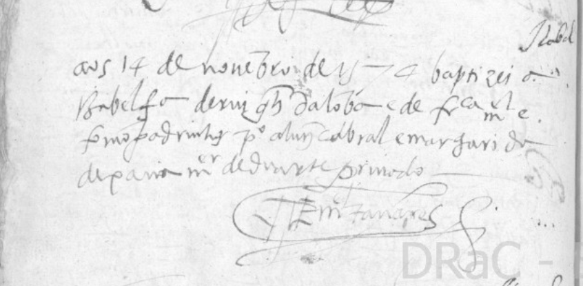 “IZABEL, aos 14 de novembro de 1574 baptizei a IZABEL fa de RUI GLZ da lomba e de FRCA MEL foram padrinhos […] Cabral e Margarida de […] mer de […]”