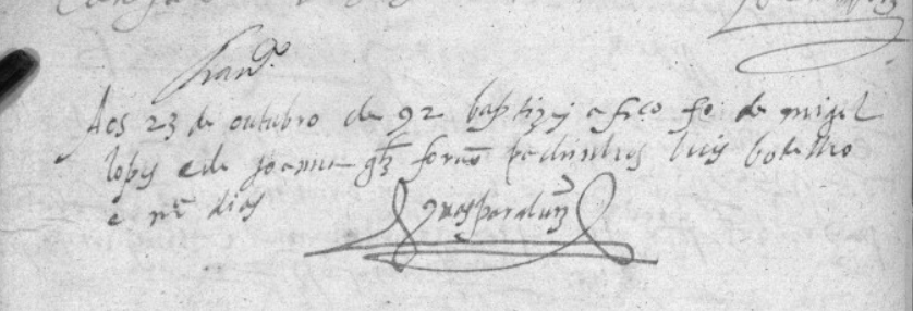 “Aos 23 de outubro de 92 baptizei a FRCO fo de MIGUEL LOPEZ e de JOANNA GLZ forão padrinhos Luiz Botelho e Ma Dias […]”