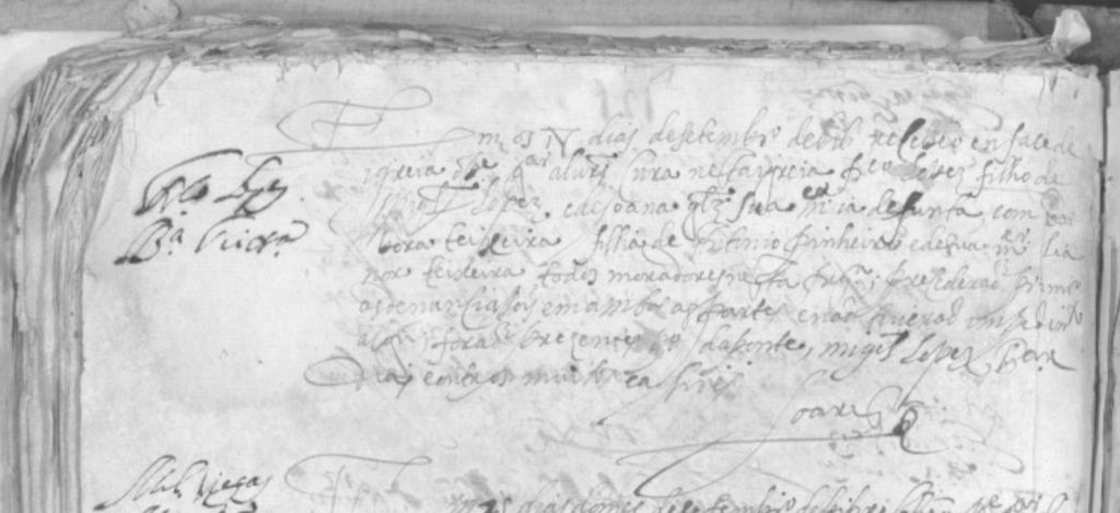 “Em os 18 dias de Setembro de 616 recebeo en face de igreja […] FRCO LOPEZ filho de MIGUEL LOPEZ e de JOANA GLZ sua mer já defunta, com BARBARA TEIXEIRA, filha de ANTONIO PINHEIRO e de sua mer LEONOR TEIXEIRA, todos moradores nesta frega precederão primeiro denunciações em ambos as partes e não houverão impedimento; forão presentes […], MIGUEL LOPEZ […]”