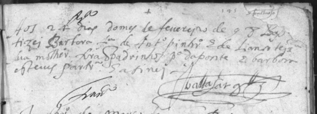 “Aos 24 dias do mes de fevereiro de 98 baptizei BARBARA fª de ANTO PINHRO e de LIANOR TEIXA sua mulher. Forao padrinhos Pº da Ponte e Barbara Esteves partrª. E asinei. Baltasar Glz.”