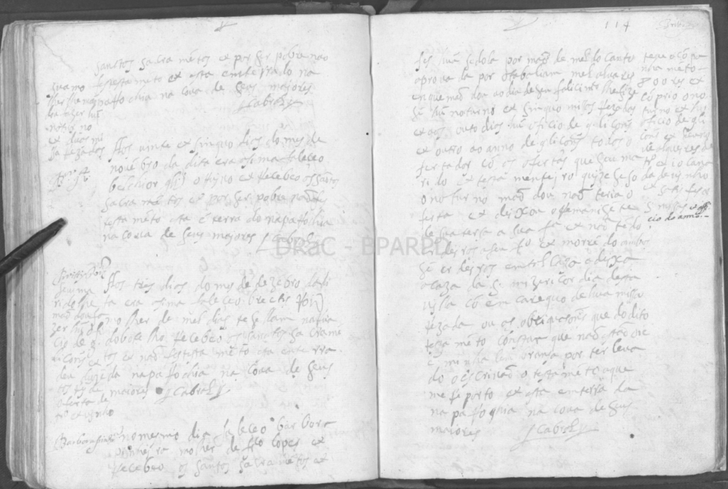 “No mesmo dia (03 de dezembro de 1626) faleceo BARBARA PINHRAmolher de FRCO LOPES e recebeo os santos sacramentos e fes húa sedola por mão de Mel do Canto aprovada por o tabeliam Mel Álvares em que mao dou ao dia do seu falicintº lhe fize se hú no turno e sinquo missas rezadas e aos outo dias hú oficio de 9 liçons e outro ao anno de 9 liçons todos ofertados co as ofertas que seu marido e testamenteiro quisese só o noturno mao não teria o feito e deixou remanisente de sua terça a sua fª e não tedo erdeiros a seu fº e morrendo ambos sem erdeiros em tal casa a deixa a casa da S. Mizericórdia desta Villa co emcareguo de hua missa rezada ou as obrigações que do dito testameto constam que não estão ou é minha lembransa por ter levado o escrivão o testamento a que me reporto e está enterrada na paróquia na cova de seus maiores. Teve acópanhameto 800 res e cóprio o noturno e hu oficio de 9 liçons e deu nove alqueires de trª e o […] de vinho e satisfes as s. missas e officio do anno. Cabral.”