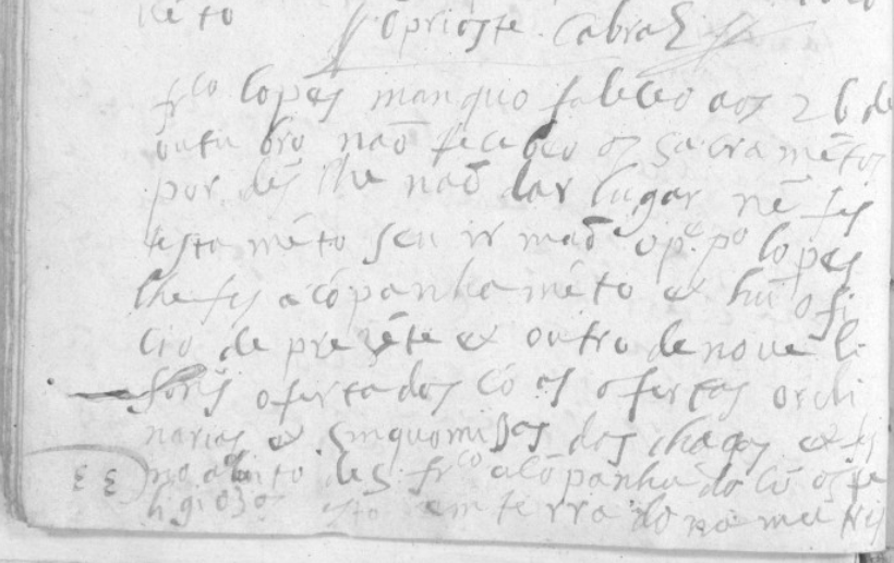 “FRANCO LOPES Manquo faleceo aos 26 de outubro de 641 não recebeo os sacrametos por dis lhe não dar lugar ne fes testamento seu irmão o P.e Pº Lopes lhe fes acopanhaméto e hú oficio de prezéte e outro de nove lisons ofertados có as ofertas ordinárias e sinquo missas das chagas e fes no abito de S. Frcº acópanhada co os religiosos e está emterrado na mesma cova de seus maiores. O prior Cabral.”