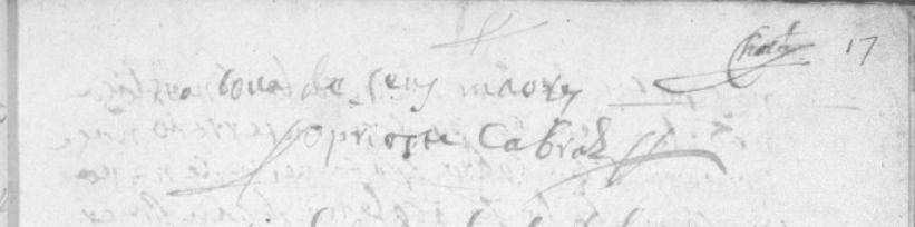 “[…] Em os 26 dias do mes de Marso de 617 annos baptizou ho Pe Simã Luis a ANTº fº de AMARO PACHECO e de sua mer INES DE MIDROS. forao Padrinhos Mel de Frias e Mª Alves, mer de Fernão de Olivrª. Crisostomo. […]”